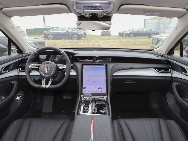 进入车内,仪表台采用激光绗缝工艺的澳洲小牛皮,缝合线距严格控制在3mm。玄影版专属的石墨黑+月白蓝配色中,蓝色部分使用天然植物染料,经欧盟OEKO-TEX认证。而配备的12.6英寸竖置中控屏采用防眩光AG玻璃,强光下可视性提升40%。车机搭载骁龙8155芯片,语音助手支持连续对话和方言识别。独创的"旗偲"虚拟助手能通过3D人脸识别自动切换驾驶员个性化设置。256色氛围灯可随音乐节奏渐变,亮度支持0-100%无级调节。储物方面,车内门板储物格采用可拆卸分隔设计,最多可并列放置4瓶550ml矿泉水。后备厢暗藏下沉式工具箱,备胎位置改造为48L隐藏储物格。